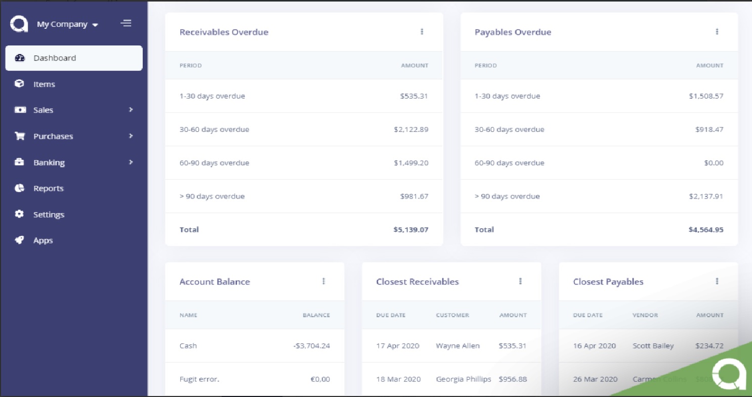 Receivables & Payables. This app ships with 4 widgets for receivables and payables. Receivables Overdue: Shows the total receivables overdue grouped in 30 days period. Payables Overdue: Shows the total payables overdue grouped in 30 days period. Closest Receivables: Shows the list of the closest invoices payable to you. Closest Payables: Shows the list of the closest bills you need to pay. Finally, you can select employees during the bill/payment creation just as vendors in order to create expenses related to them.